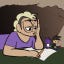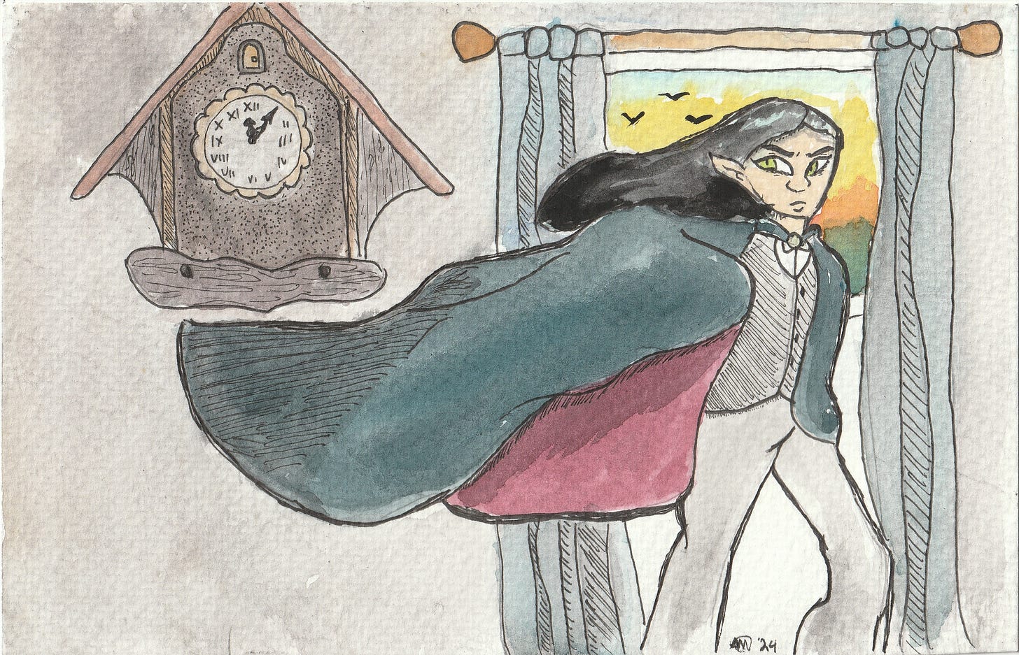This vampire is based on some sketches I made of a vampire last year, initially for a Halloween mini comic (may revisit that one). I wanted to play by one of Bram Stoker's Dracula rules; "unable to transform until noon, dawn and dusk." I accidentally included "casts no shadow" because I was utterly fed up with this painting, so I quit. I wanted to avoid the most common thing I see about vampires, the pale skin (an attempt was made). I also don't feel like I don't see enough vampires in simple, less ornate clothing, so I opted for this vest and slacks look. The idea of this was to make the vampire look like they were about to go on the hunt at dusk when they could transform and feast. Pretend the clock is broken. Broken clock stuck at past noon aside, I like how some of it turned out, chiefly the clock, and trying to make the sun look like it's being cast on the vampire. It just wasn't turning out how I wanted it to in general. Not my favorite, not my least favorite, but certainly an exercise in doing something a little different than normal.